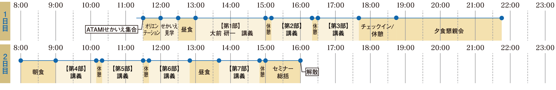 会場となる「ATAMIせかいえ」は大前研一が企画、設計に関与したエグゼクティブ研修所です。 世界中のリゾートを見てきた大前にとっても「感動を覚える」と言う絶景と豊富な湯量を誇る温泉をご堪能いただけます。非日常的な空間で、その時々のキーパーソンと少人数で語りあうことで、 新しい発想、出会いがきっと得られるはずです。