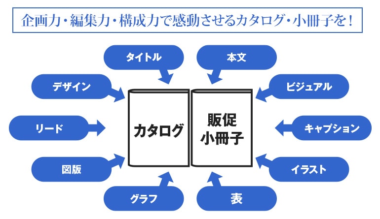 売上拡大を狙って、顧客となる生活者に製品や商品の魅力や特徴を伝えていくためには、ターゲットを刺激する個性的な「カタログ・販促用小冊子・マンガ小冊子」を活用していく手法がベストだといわれています。ただし、効果を飛躍的に上げていくためには、どんな冊子をつくり上げるのか、しっかりと練り込む必要があります。ここで重要となるのが、まさしく「企画力」と「編集力」、そして「構成力」。デザイン、タイトル、リード、本文、ビジュアル、キャプション、図版、グラフ・表、マンガ表現……などを立体的に組み合わせながら、わかりやすく、ターゲットが感動するようなツールに仕上げていく、これは雑誌づくりのプロだからこそできる仕事となります。