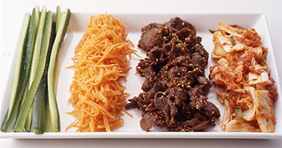 牛こま肉 200g a:昆布茶、酒、味醂、醤油 各大さじ2、砂糖 小さじ2、 コチュジャン 小さじ1くらい、生姜の千切り 1/4片分 白胡麻 大さじ1 にんじんの千切り 小1本 きゅうり 1本 キムチ 200g 塩 小さじ1 すし飯 基本の全量 板海苔 4枚