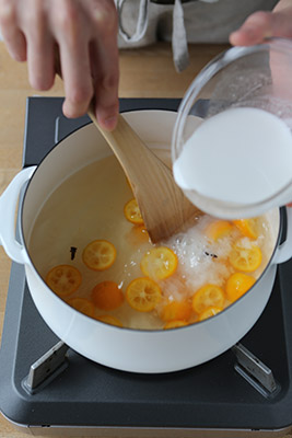 鍋に金柑、砂糖、水、クローブを入れ中火にかける。煮立ってきたら弱火にし、アクを取りながら15分ほど煮る。