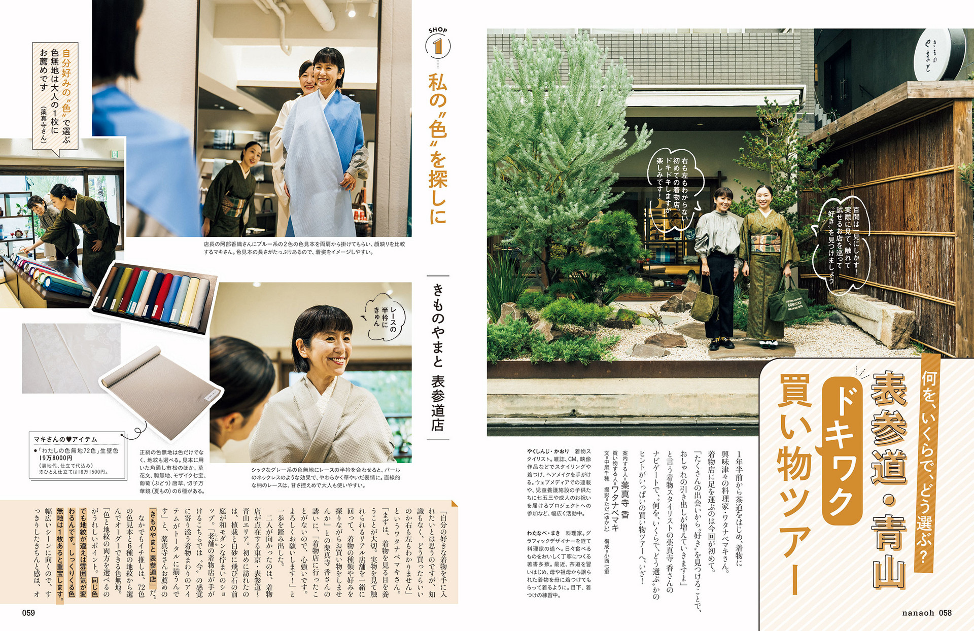 1年半前から茶道をはじめ、着物に興味津々の料理家・ワタナベマキさん。 着物店に足を運ぶのは今回が初めて。 「たくさんの出会いから“好き”を見つけることで、おしゃれの引き出しが増えていきますよ」 と言う着物スタイリストの薬真寺 香さんのナビゲートで、“何を、いくらで、どう選ぶ”かのヒントがいっぱいの買い物ツアーへ、いざ!