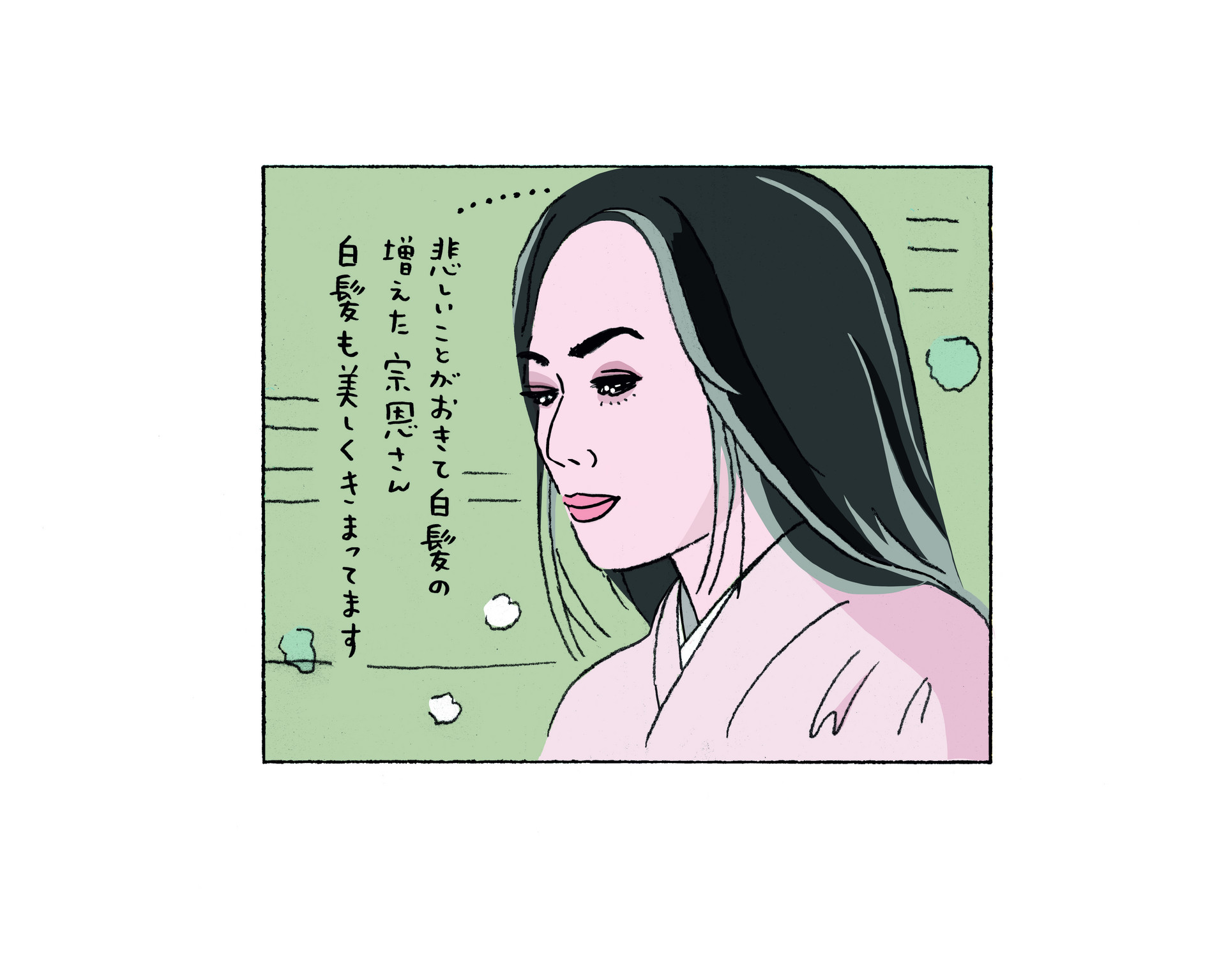 宗恩の、利休に差し出された茶碗を手にしてこぼれる慈しみの表情からは、夫の美学への理解の深さが伝わってきて、これが正解なんだなと思わされる。そんな宗恩のお召し物は、かすかにさくら色を感じる上質の無地の着物と幅の狭い帯。無駄を削(そ)ぎ落とした極上感に吸い込まれそうになった。髪は後ろで一つに束ね長く垂らした「下げ髪」で中世の雰囲気。夫がセンスの塊のような人だと妻は肩が凝って大変だろうなあ、と思うのだけど、お宅はどうでしたか?と、私は宗恩にたずねたい。