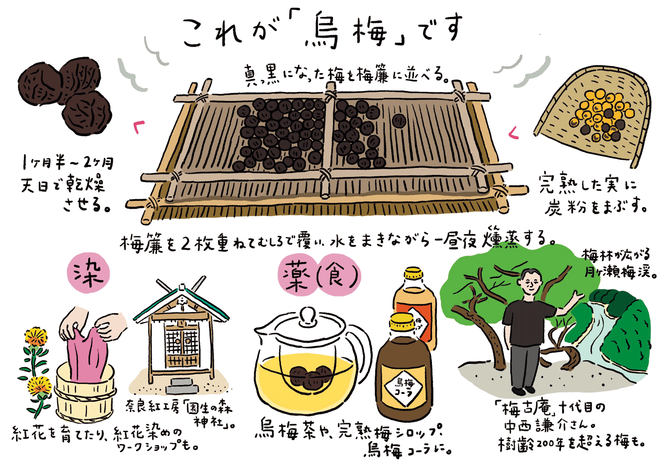周囲からは反対や懸念も多かった。が、中西さんは揺るがない。歴史に学び、製法を守り、未来への工夫を少しずつ。口伝の製法、素材、道具、全てが理に適(かな)っている。梅雨時に完熟落ち梅を拾い集め、炭粉をまぶして梅簾(すだれ)に並べ、濡(ぬ)れ筵(むしろ)をかけ、かまどの上で燻蒸し、真夏に天日干し。一つ一つに、先人の知恵と神聖な気配が宿っている、と。攻守の塩梅を見極めながら、中西さんは月ヶ瀬梅渓の原点たる烏梅の未来を拓(ひら)いていく。