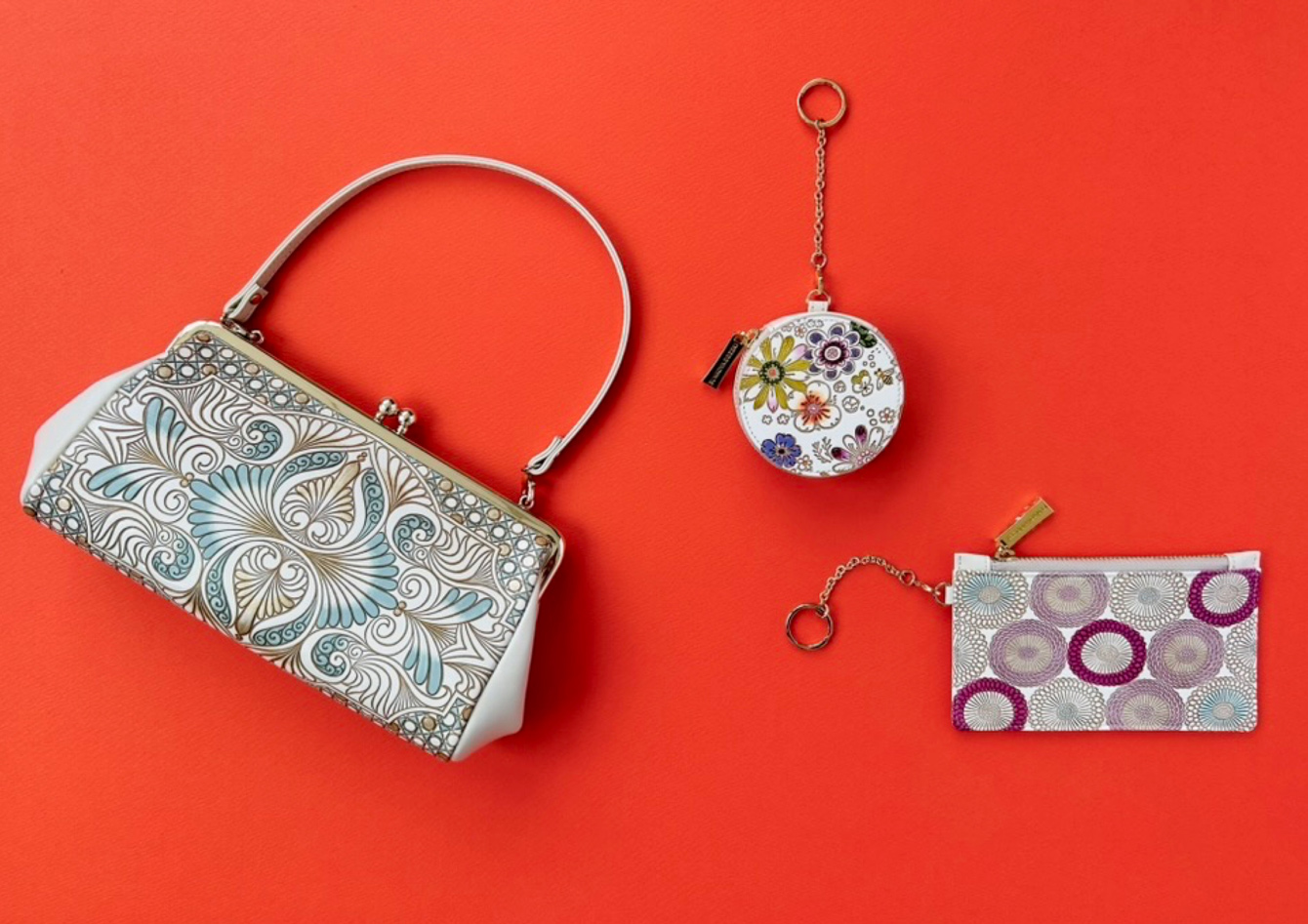 多彩な柄の財布やバッグ。