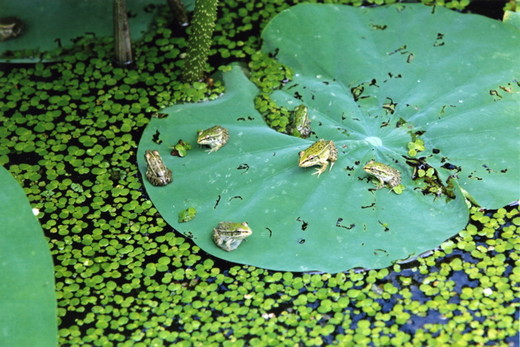 - 2012年の7月末、奈良県御所市、九品寺の前庭にてハスの開花の様子を撮影しました。花はまだ蕾で残念でしたが、ふと足下を見ると、水面の涼しげな葉の上に数匹のカエルが集っており、思わず引き込まれるようにカメラを向けました。この静かな田園風景が、悠久の地であることを願っています。