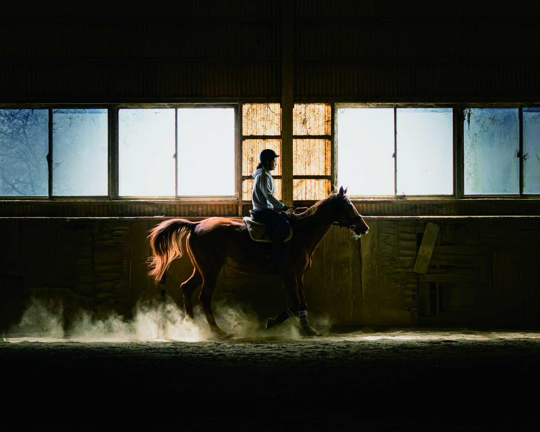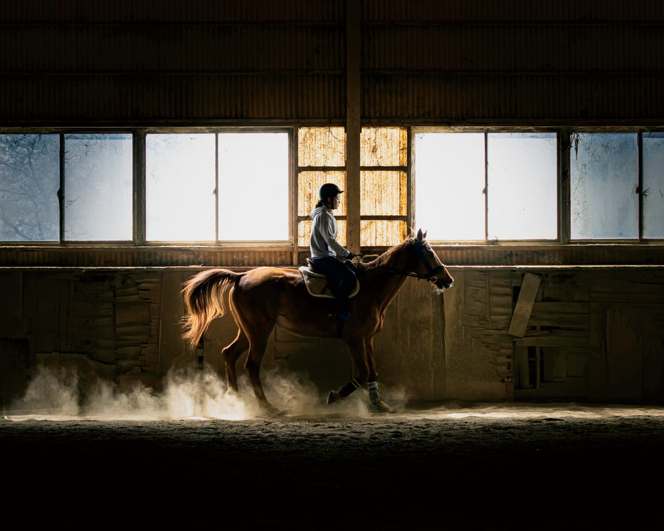 静寂の中を列車が走り抜ける瞬間を捉えた印象的な作品。リフレクション効果で音のない静かな世界観が巧みに表現され、時間が止まったかのよう。視覚だけでなく感情にも訴える力があります。佳作は窓から差し込む光が「人馬一体」をクローズアップする「鞍上人なく、鞍下馬なし」、自然の雄大さと人間を対比させた「凍てついた轟音」でした。