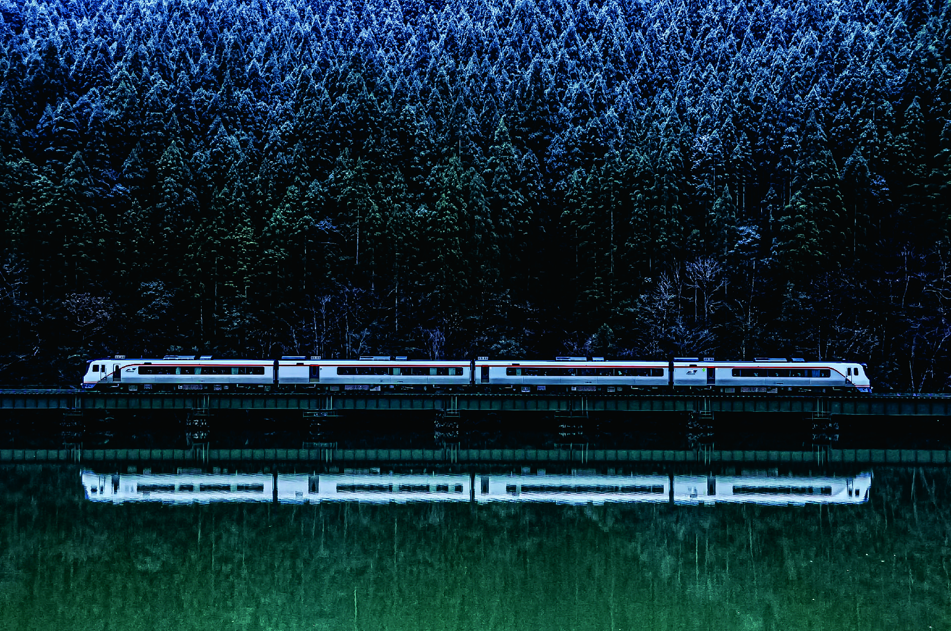 動感を重んじる鉄道写真の中にあって、まるで静止したかのようなたたずまいの、美しさにあふれる車両の描写が独特の魅力を放っている優秀賞受賞作品「旅路、森とともに」。背景に広がる森の雰囲気と、湖面への反映を実景と響き合わせた世界観など、まるで