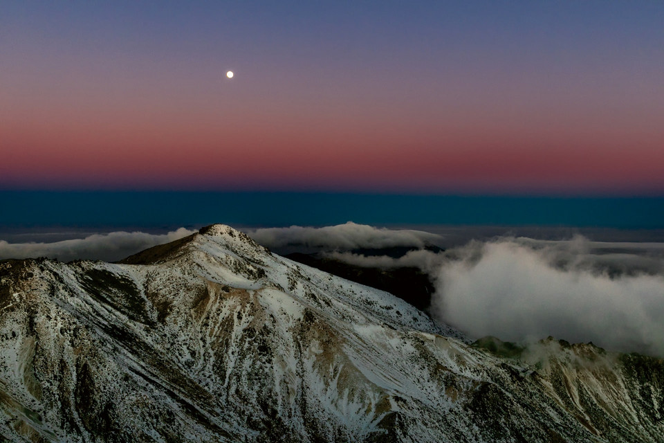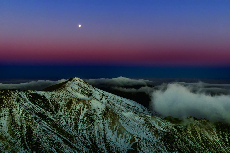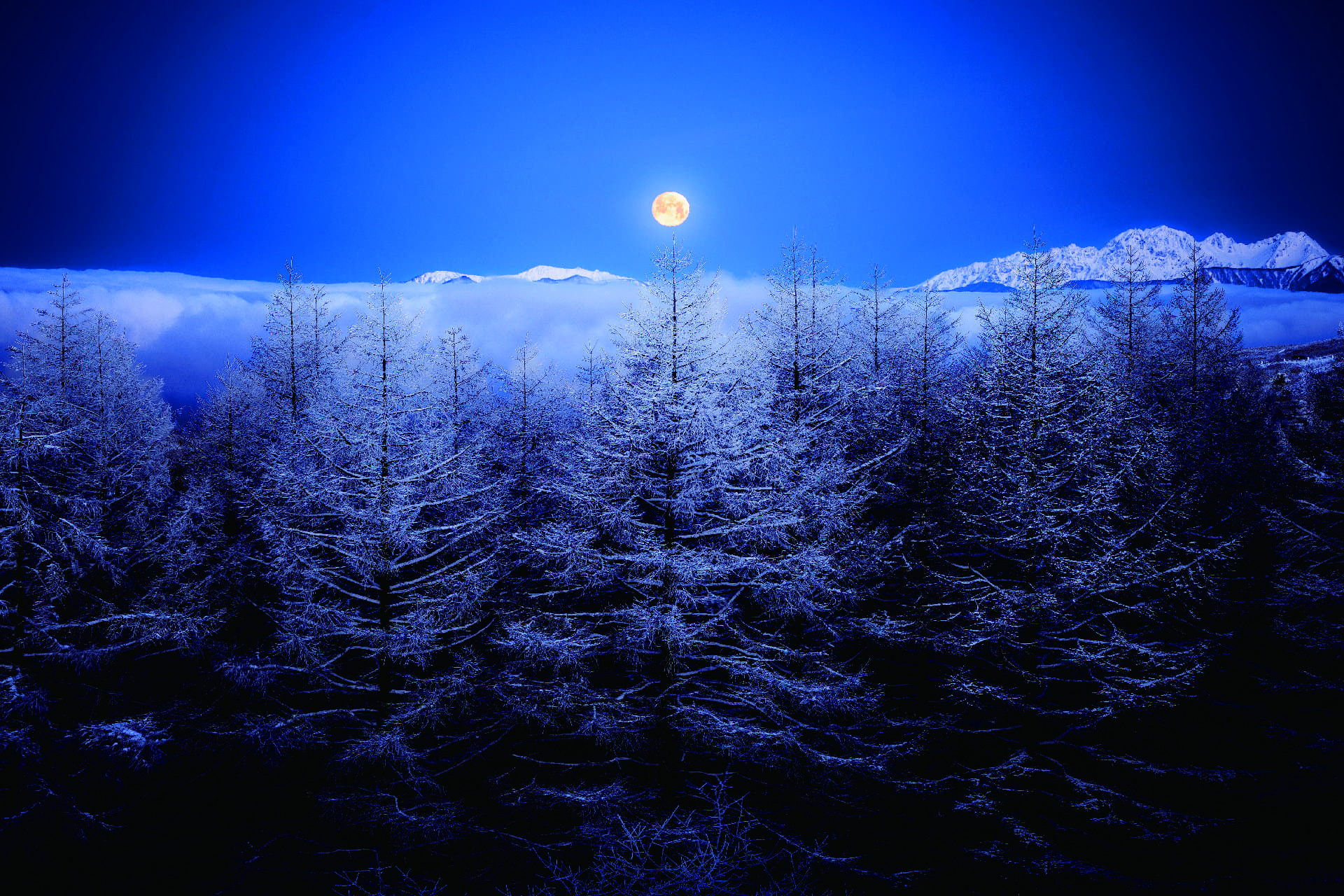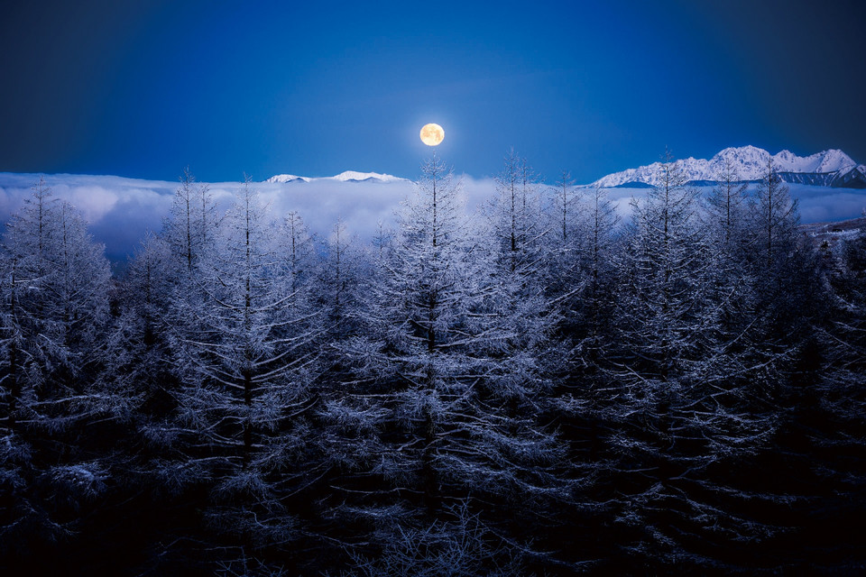 今回優秀賞に選定した「月夜の高原」は、いてつくような青色の風景の中、遠くに望む月の光が同心円のように、霧氷に覆われた白い木々と雲海、遠くに望むアルプスの山々を照らし出しています。冬の森の風景を鳥たちの目線で追ったような幻想的な一枚。青と黄の対照的な色彩が美しいコントラストを描き、その場、その時の光と空気が凝縮されています。