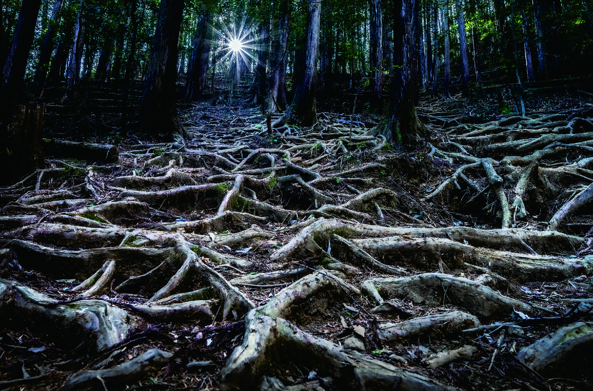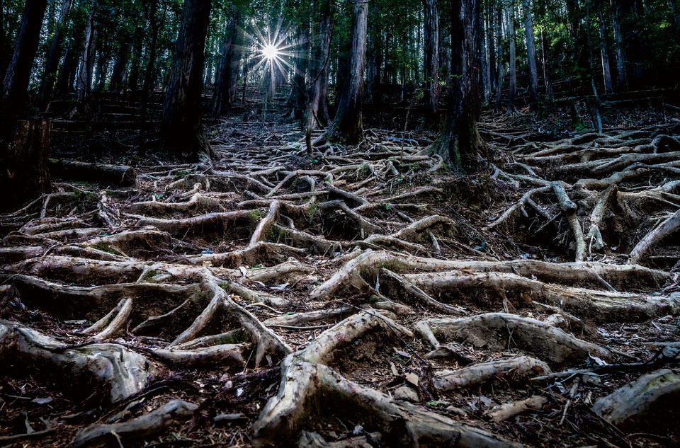 「大地に根を張る」については、雨水によって土壌が流されて厳しい環境下に置かれても、絡み合い強く大地を支える杉の根の姿から、自然の